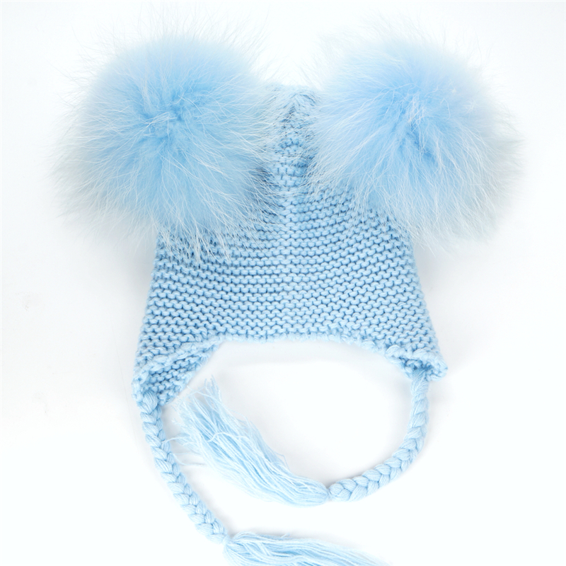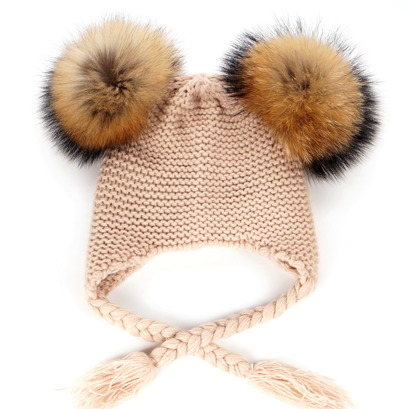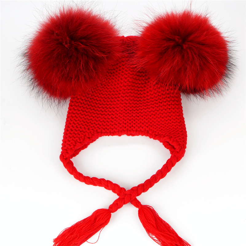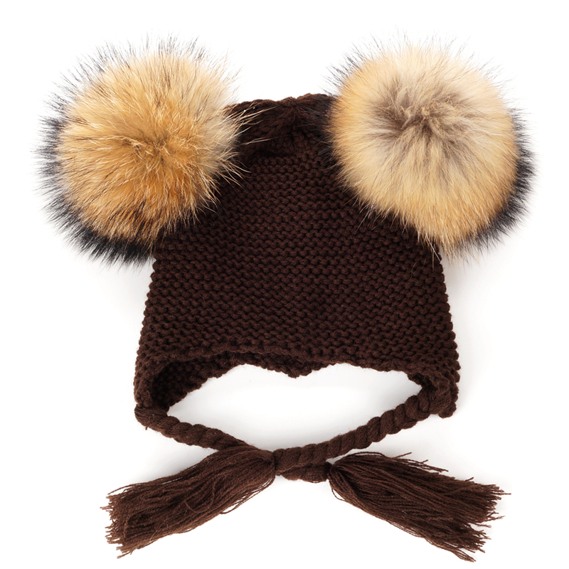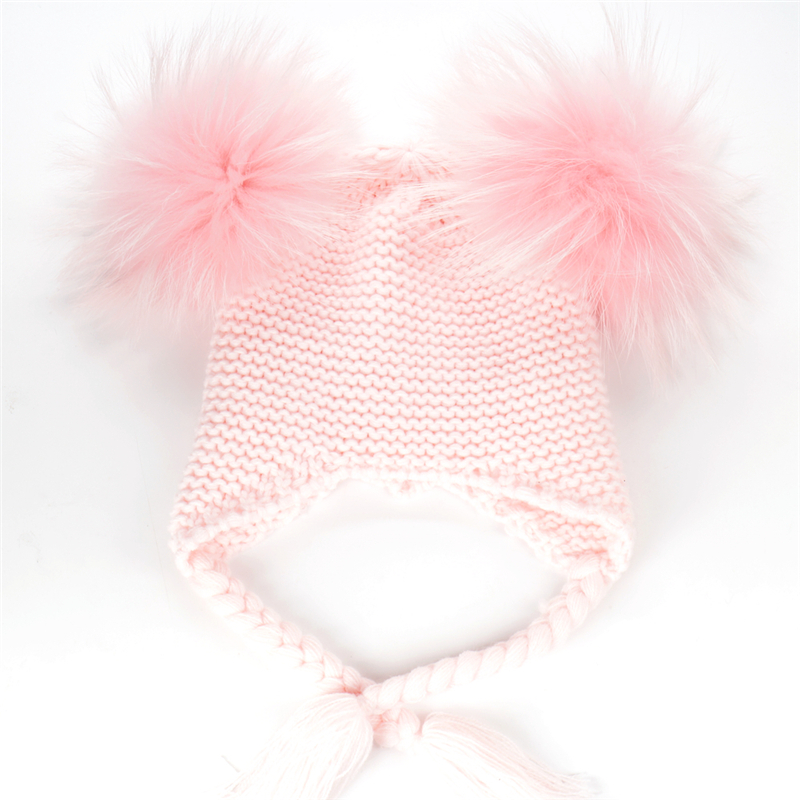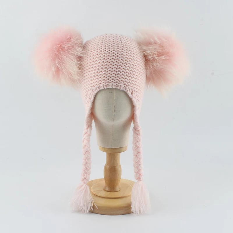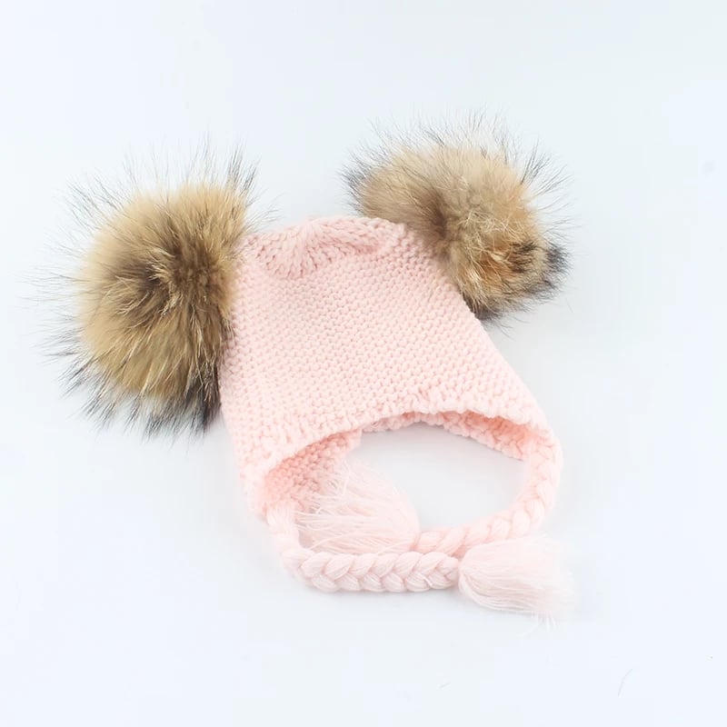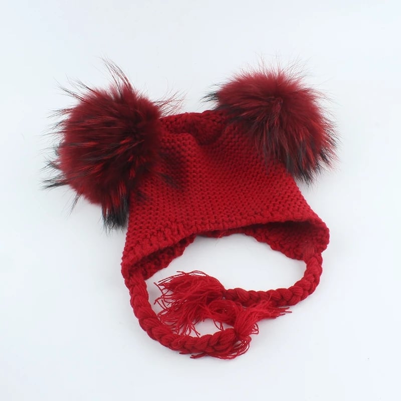 Czapka dziecięca z naturalnymi pomponami z jenota. Pompony są wypinane, co daje możliwość ręcznego prania czapki.