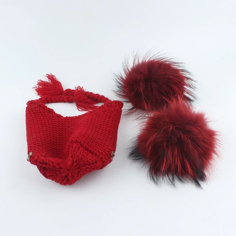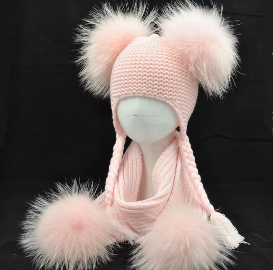 Na życzenie klienta, możliwość skompletowania czapki z szalikiem z pomponami naturalnymi, lub doborem innego koloru pomponów