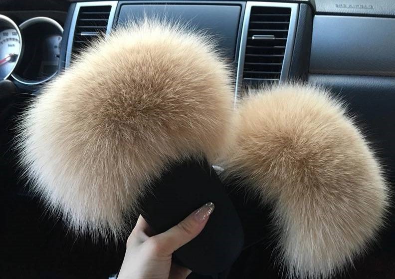 Klapki damskie z puszystym futrem z  naturalnego lisa piesaka