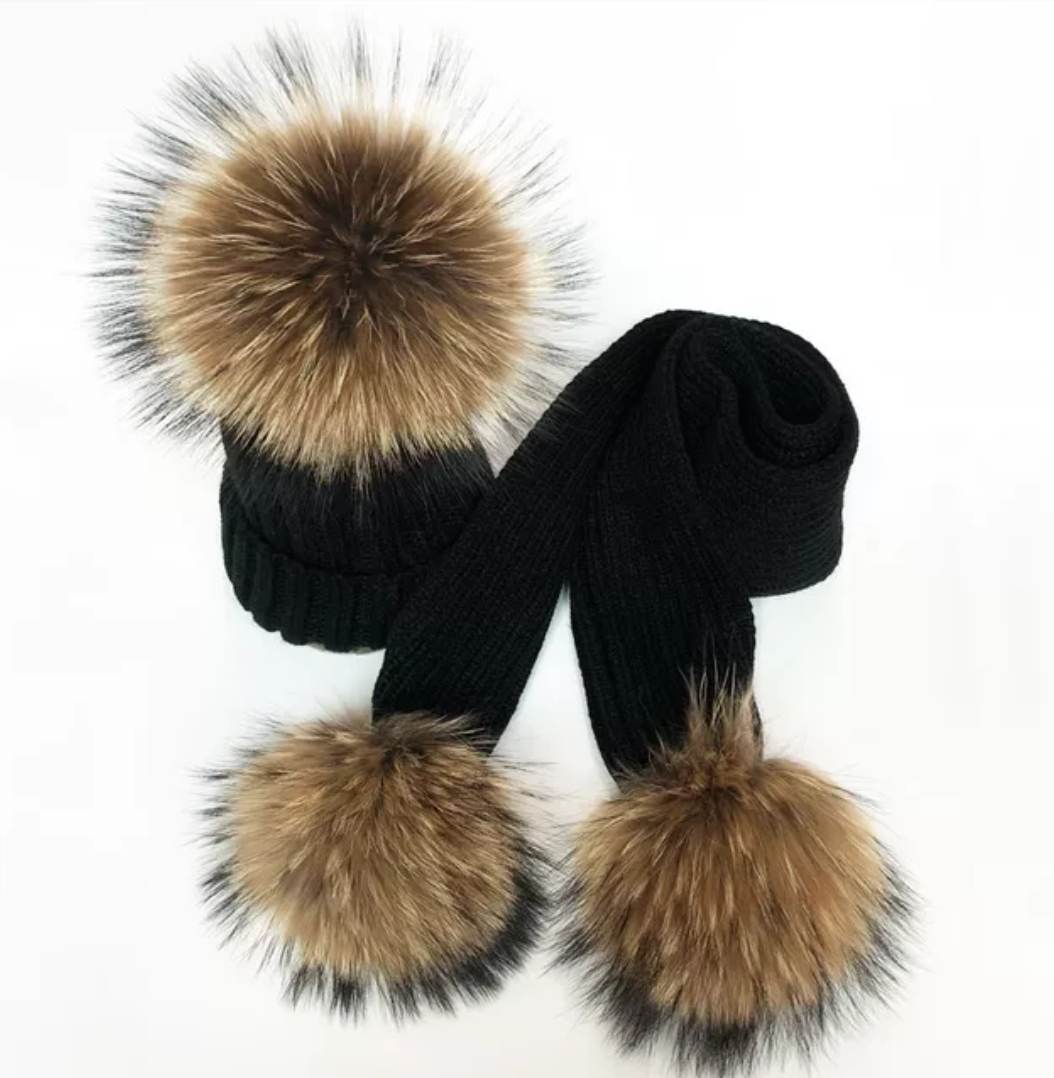Zestaw zimowy czapka oraz szalik z naturalnymi pomponami z futra jenota, pompony są odpinane na zatrzaski zarówno z czapki jak i szalika, co daje możliwość wyprania ręcznie zestawu. Czapka mocno się naciąga co oznacza że świetnie dopasowuje się do głowy