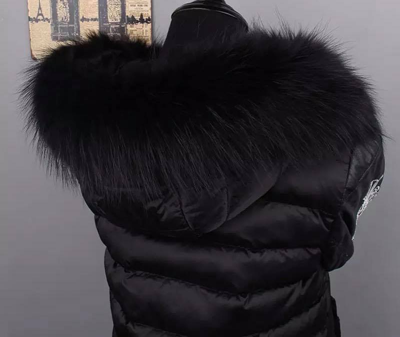 Obszycie do kaptura wykonane z najwyższej jakości naturalnego futra jenota barwione na kolor czarny , szyte z całości z grzbietów, czyli z najładniejszej partii skóry . Obszycie posiada gumowe pętelki na guziki, które doszywa się do kaptura ( nie są w zestawie ). Obszycie dodaje kurtce nowoczesnego i eleganckiego wyglądu. Obszycie od spodu jest wykończone satynową podszewką w kolorze czarnym.