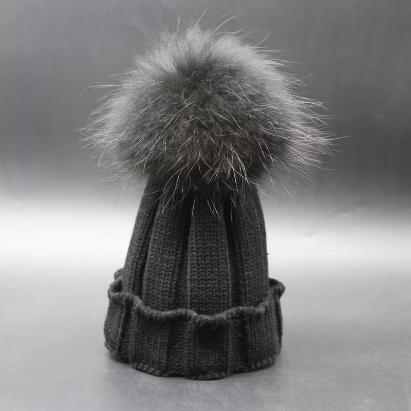 Zimowa czapka dziecięca w kolorze czarnym z naturalnym pomponem z jenota