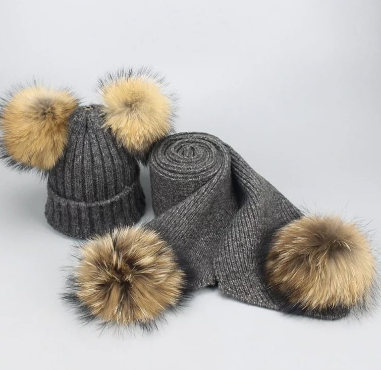 Komplet zimowy szalik oraz czapka z futrzanymi pomponami z jenota, pompony są odpinane na zatrzaski, co dalej możliwość wyprania produktu ręcznie lub w pralce w 30 stopniach. Czapka nie jest podszyta od spodu polarem, mimo to jest bardzo ciepła