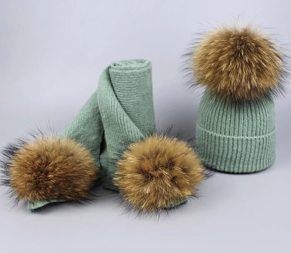 Zimowy zestaw dziecięcy szalik oraz czapka z pomponami z futra jenota naturalnego. Pompony są mocowane na zatrzaski, co daje nam możliwość wypięcia ich do prania produktu ręcznie. Czapka nie jest ocieplana od spodu polarem.